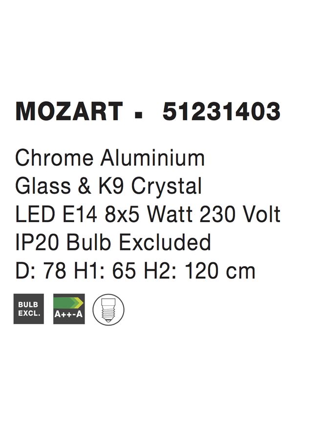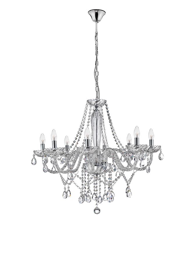 Срок на доставка: ПО ЗАПИТВАНЕ Продуктова информация Материал: Chrome Aluminium Glass & K9 Crystal Тип крушка: LED E14 8x5W IP20 Bulb Excluded Код: 51231403 Тип продукт: CHANDELIERS Размери: D: 78 H1: 65 H2: 120 cm