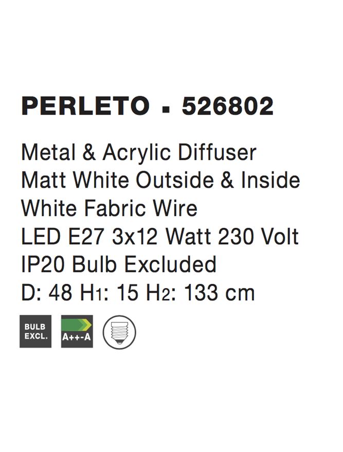 Срок на доставка: ПО ЗАПИТВАНЕ Продуктова информация Материал: Metal & Acrylic Diffuser Matt White Outside & Inside White Fabric Wire Тип крушка: LED E27 3×12 Watt 230 Volt IP20 Bulb Excluded Код: 526802 Тип продукт: HIVE Размери: D: 48 H1: 15 H2: 133 cm