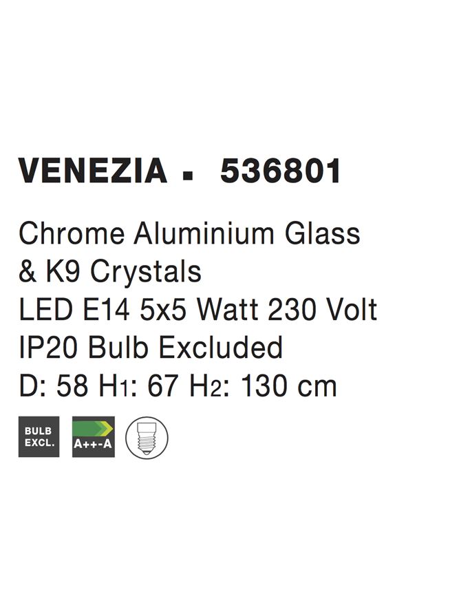 Срок на доставка: ПО ЗАПИТВАНЕ Продуктова информация Материал: Chrome Aluminium Glass & K9 Crystals Тип крушка: LED E14 5x5W IP20 Bulb Excluded Код: 536801 Тип продукт: CHANDELIERS Размери: D: 58 H1: 67 H2: 130 cm