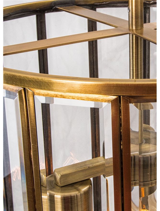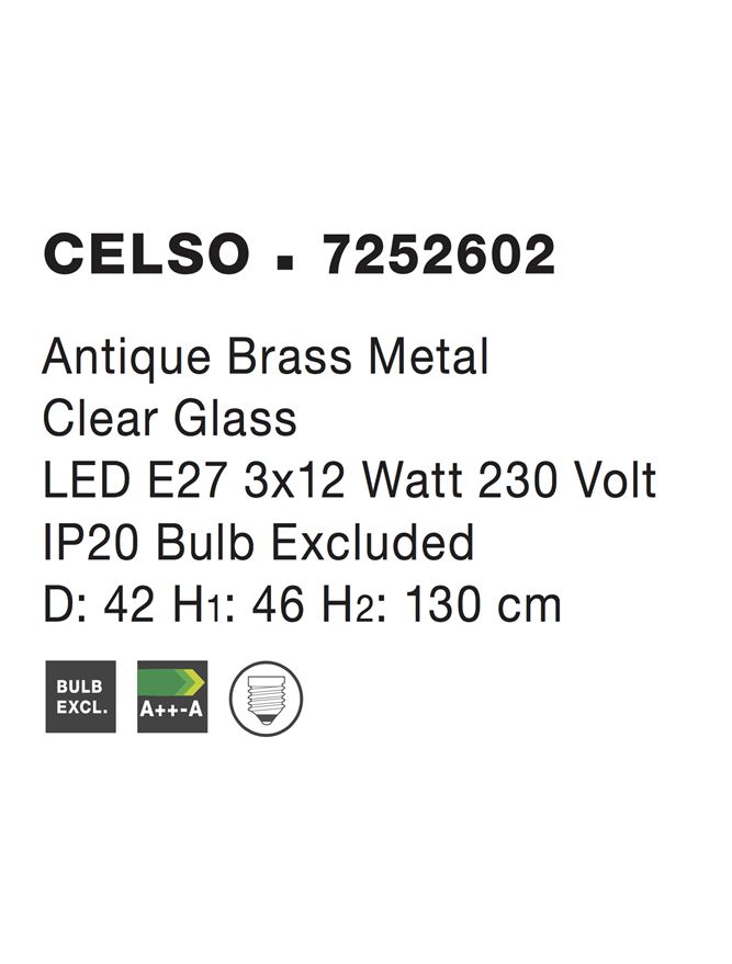 Срок на доставка: ПО ЗАПИТВАНЕ Продуктова информация Материал: Antique Metal Brass Clear Glass Тип крушка: E27 3x60W IP20 Bulb Excluded Код: 7252602 Тип продукт: NOUVELLE Размери: D: 42 H1: 46 H2: 130 cm