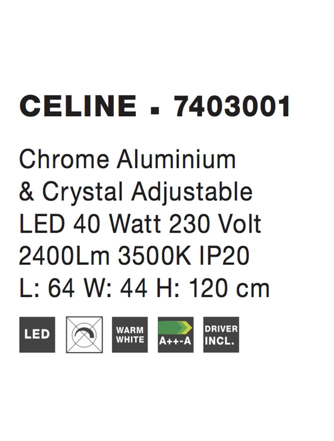 Срок на доставка: ПО ЗАПИТВАНЕ Продуктова информация Материал: Chrome Aluminium & Crystal Adjustable Тип крушка: LED 40 Watt 230 Volt 2400Lm 3500K IP20 Код: 7403001 Тип продукт: CRYSTAL Размери: L:64 W:44 H: 120 cm