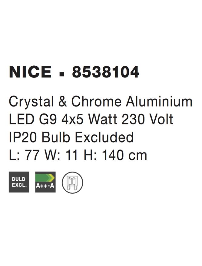 Срок на доставка: ПО ЗАПИТВАНЕ Продуктова информация Материал: Clear Crystal & Chrome Aluminium Тип крушка: LED G9 4×5 Watt IP20 Bulb Excluded Код: 8538104 Тип продукт: CRYSTAL Размери: L: 77 W: 11 H: 140 cm