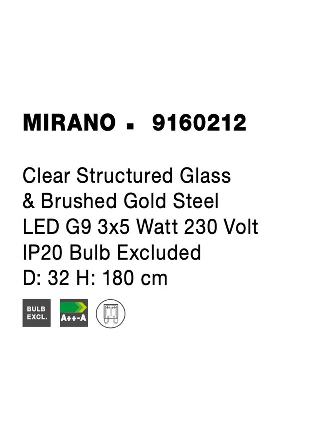 Срок на доставка: ПО ЗАПИТВАНЕ Продуктова информация Материал: Clear Structured Glass & Brushed Gold Steel Тип крушка: LED G9 3×5 Watt 230 Volt IP20 Код: 9160212 Тип продукт: NOUVELLE Размери: D: 32 H: 180 cm