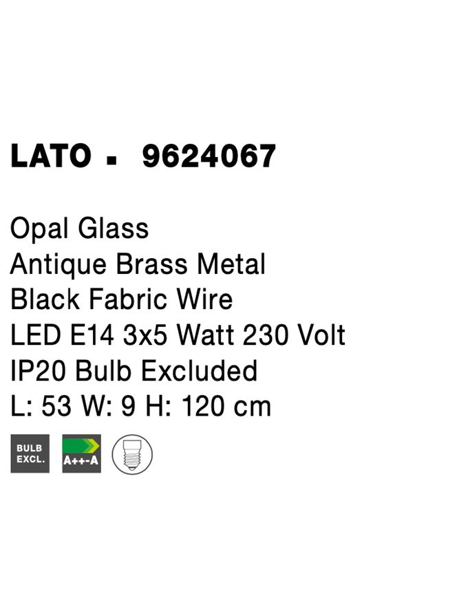 Срок на доставка: ПО ЗАПИТВАНЕ Продуктова информация Материал: Opal Glass Antique Brass Metal Black Fabric Wire Тип крушка: LED E14 3×5 Watt 230 Volt IP20 Bulb Excluded Код: 9624067 Тип продукт: NOUVELLE Размери: D: 15.8 L: 53 W: 9 H: 120 cm