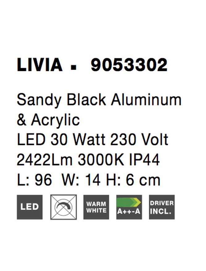 Срок на доставка: ПО ЗАПИТВАНЕ Продуктова информация Материал: Sandy Black Aluminium & Acrylic Тип крушка: LED 30W 230V 2422Lm 3000K IP44 Код: 9053302 Тип продукт: BATHROOM Размери: L: 96 W: 14 H: 6 cm
