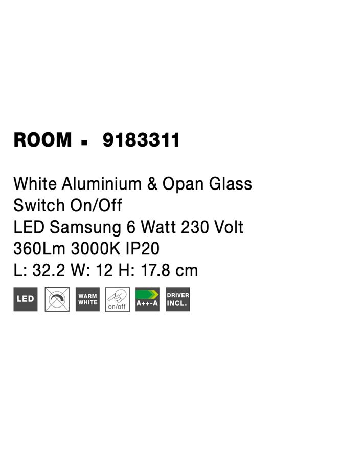 Срок на доставка: ПО ЗАПИТВАНЕ Продуктова информация Материал: White Aluminium & Opal Glass Тип крушка: LED Samsung 6W 230V 360Lm 3000K IP20 Код: 9183311 Тип продукт: WALL LUMINAIRES Размери: L: 32.2 W: 12 H: 17.8 cm