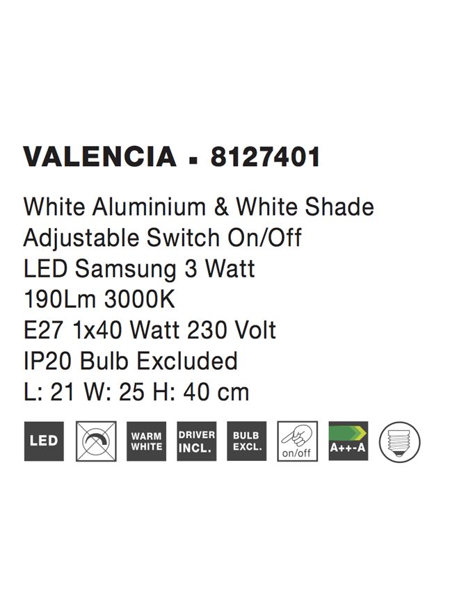 Срок на доставка: ПО ЗАПИТВАНЕ Продуктова информация Материал: White Aluminium & White Shade Adjustable Switch On/Off Тип крушка: LED Samsung 3 Watt 190Lm 3000K E27 1×40 Watt 230 Volt IP20 Bulb Excluded Код: 8127401 Тип продукт: WALL LUMINAIRES Размери: L: 21 W: 25 H: 40 cm