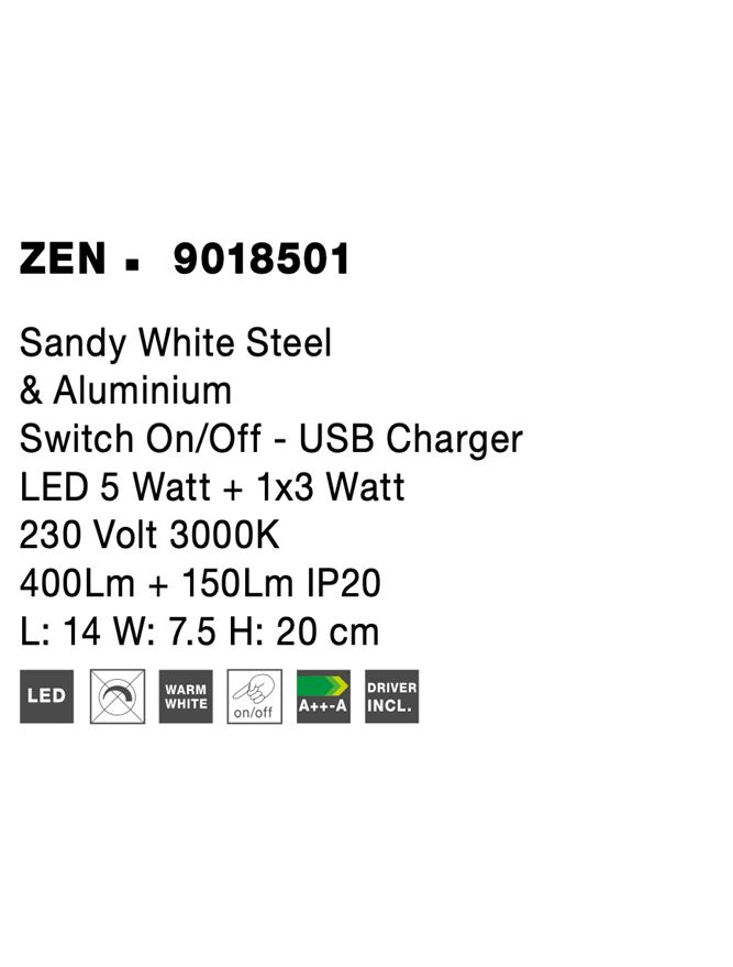 Срок на доставка: ПО ЗАПИТВАНЕ Продуктова информация Материал: Sandy White Steel & Aluminium Switch On/Off – USB Charger Тип крушка: LED 5 Watt + 1×3 Watt 230 Volt 3000K 400Lm + 150Lm IP20 Код: 9018501 Тип продукт: WALL LUMINAIRES Размери: L: 14 W: 7.5 H: 20 cm