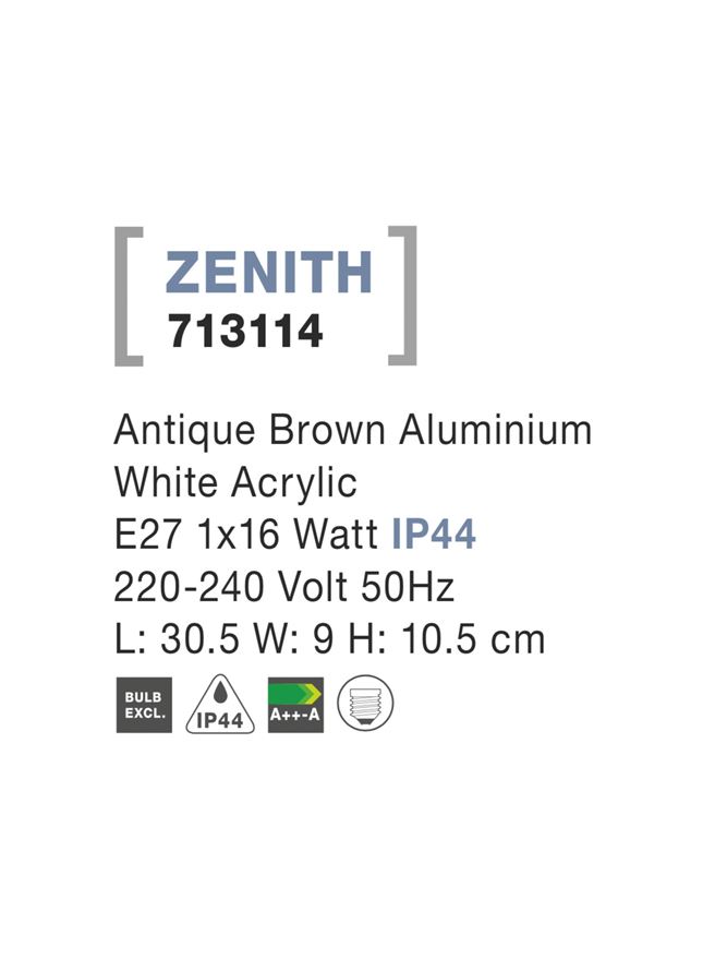 Срок на доставка: ПО ЗАПИТВАНЕ Продуктова информация Материал: Antique Brown Aluminium White Acrylic Тип крушка: E27 1×16 Watt 220-240 Volt 50Hz -IP54- Код: 713114 Тип продукт: OUTDOOR – WALL Размери: L: 30.5 W: 9 H: 10.5 cm