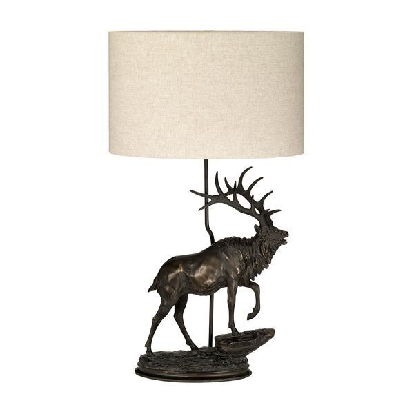 Large Stag statuette in Bronze Patina finish complete with a Laminated Oval Natural Hessian shade. ELS-DL-ANGUS-TL