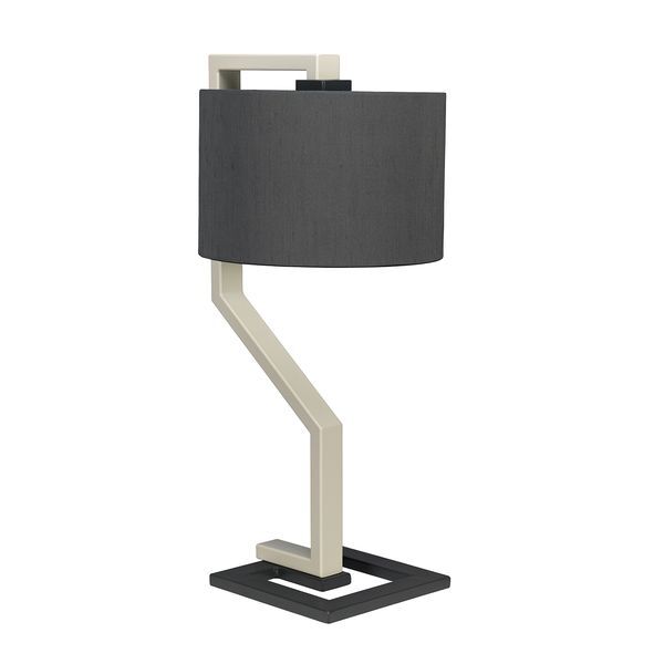 Стилна настолна лампа с модерен дизайн, изработена от отворена квадратна метална основа в тъмно сив цвят и ъглово рамо в кремав цвят и цилиндрична сива текстилна шапка. Чудесно допълнение за интериоррното осветление във вашия хол, спалня, кабинет, хотел и заведение.