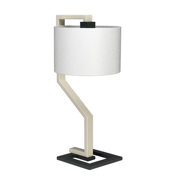 Стилна настолна лампа с модерен дизайн, изработена от отворена квадратна метална основа в тъмно сив цвят и ъглово рамо в кремав цвят и цилиндрична текстилна шапка в цвят слонова кост. Чудесно допълнение за интериоррното осветление във вашия хол, спалня, кабинет, хотел и заведение.