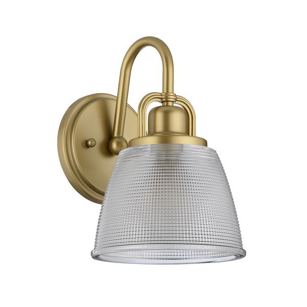Класически аплик с елегантен дизайн, състоящ се от цвят месинг кръгла стоманена основа с извито рамо и прозрачна чашка от текстурирано стъкло. Лампа с висока степен на влагозащита: IP44, която ще изпълни с изискана атмосфера и уютна светлина вашата модерна или традиционна баня.