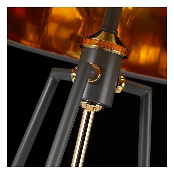 Тъмносив краката се издигат от полиран Gold база на скрити краката така на ринга се появява, за да навъртам над таблицата, пълна с цилиндър сянка на Грей полиестер, който има Metallic Gold подплата.