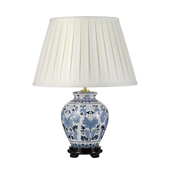 A Blue and White patterned oriental ceramic table lamp with an Ivory 100% cotton, box pleat shade. ELS-DL-LINYI-TL