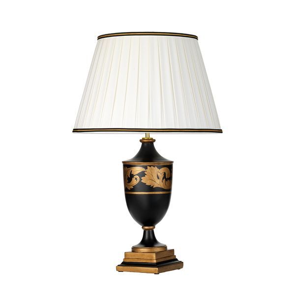 A Black wood urn base with gold painted leaves, paired with an Ivory 100% cotton, box pleat shade with black and gold trim. ELS-DL-NARBONNE-TL