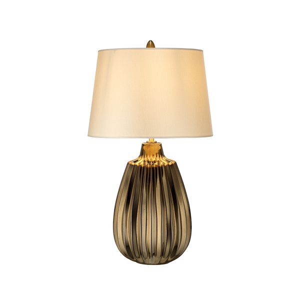 Оригинална настолна лампа със елегантен дизайн, изработена от цвят бронз оребрена керамична основа и бяла PVC шапка, покрита с текстил в перлен цвят. Лампа, която ще изпълни с уютна атмосфера и чудесна светлина вашия хол, трапезария, спалня, кабинет, хотел и заведение.