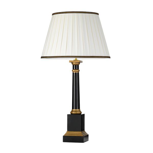 A Black wood column base with gold painted accents. Including an Ivory 100% cotton, box pleat shade with black and gold trim. ELS-DL-PERONNE-TL