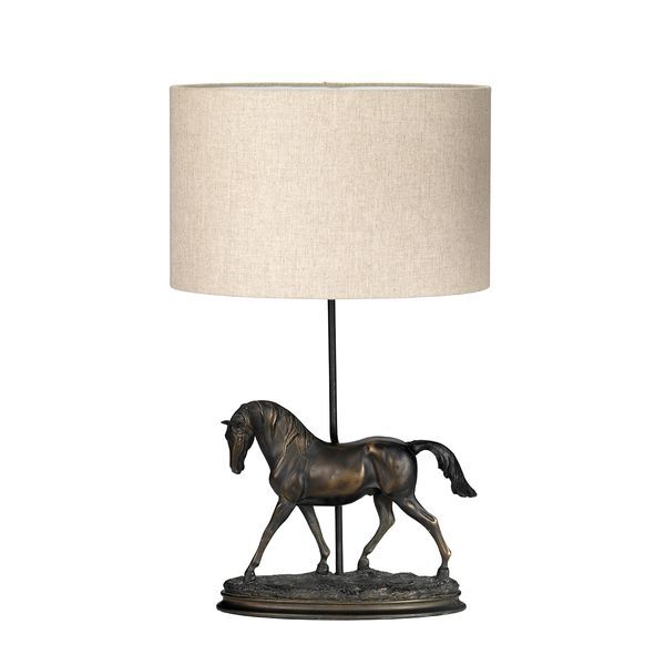 Small Horse statuette table lamp in Bronze Patina finish. Complete with a 16“ Laminated Oval Natural Hessian shade. ELS-DL-SPIRIT-TL