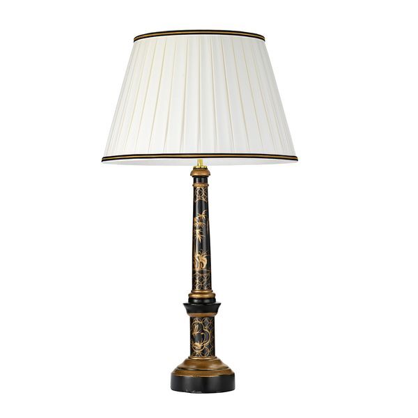 A Black decorated wood column base with gold painted accents. Completed with an Ivory 100% cotton, box pleat shade with black and gold trim. ELS-DL-STRASBOURG-TL