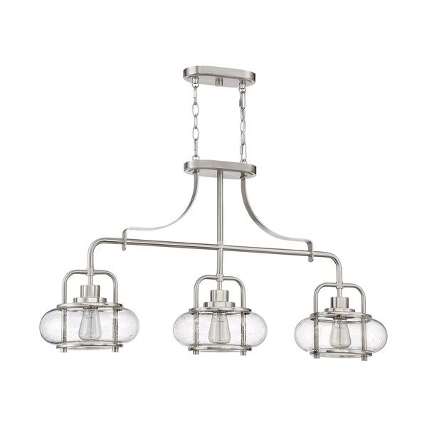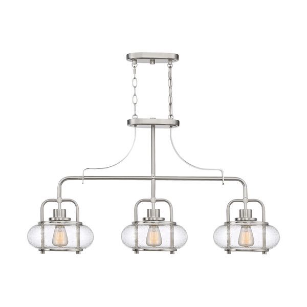 Now available in Brushed Nickel, Trilogy comes to life when used with Thomas Edison style LED filament lamps. A nostalgic yet chic design with clear seeded glass shade, Trilogy brings old world style to modern elegance. ELS-QZ-TRILOGY-ISLE-BN