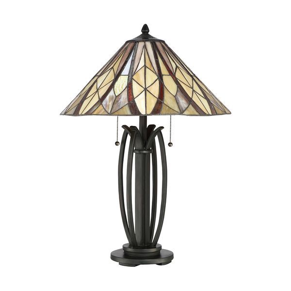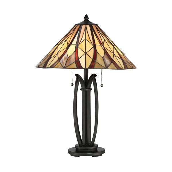 Великолепна настолна лампа с класически дизайн, изработена от метална основа в цвят античен бронз и шапка от стъкло „Тифани“ с оттенъци на червен, жълт и цвят кехлибар, подредени в широки кръстосани шарки. Стилна лампа, която ще придаде елегантност и блясък на вашия хол, трапезария, спалня, кабинет, хотел и ресторант.