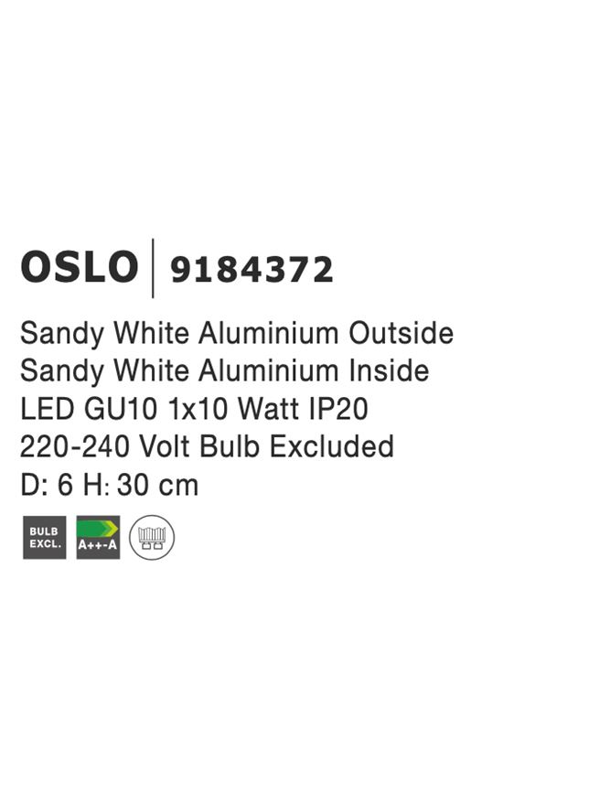 Срок на доставка: ПО ЗАПИТВАНЕ Продуктова информация Материал: Sandy White Aluminium Outside and Inside Тип крушка: GU10 1×50 Watt 230 Volt IP20 Bulb Excluded Код: 9184372 Тип продукт: GU10 AND LED SPOTS Размери: D: 6 H: 30 cm