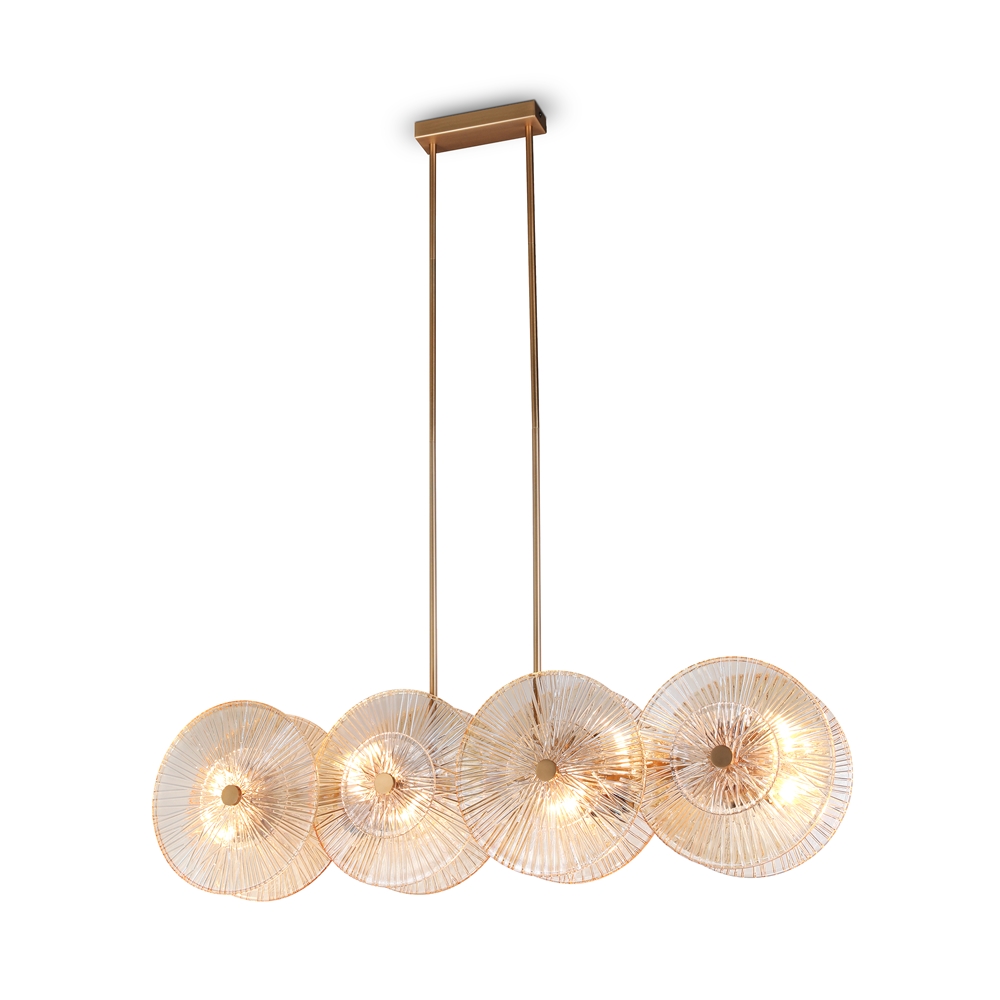 Описание на продукта: Метални фитинги, златен цвят. Декорът е изработен от щамповано стъкло в прозрачен цвят с кехлибарен нюанс. Регулируема височина на окачването на лампата.