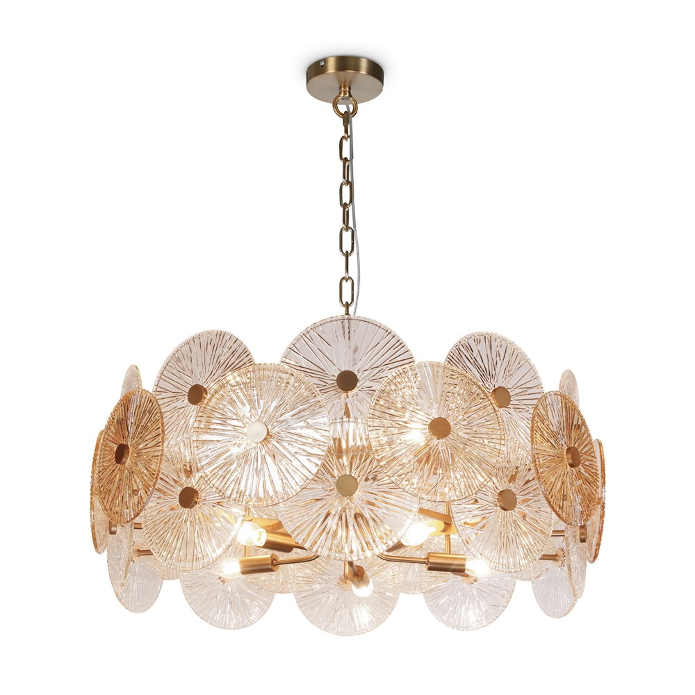 Описание на продукта: Метални фитинги, златен цвят. Декорът е изработен от щамповано стъкло в прозрачен цвят с кехлибарен нюанс. Регулируема височина на окачването на лампата.