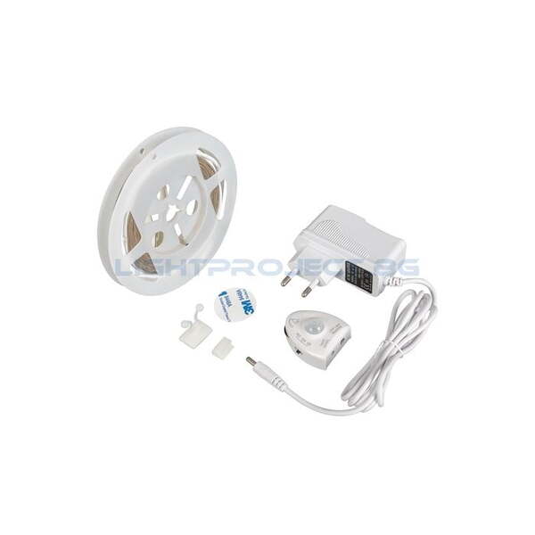 Комплектът съдържа: LED лента, сензор за движение и осветеност и захранващ адаптер.