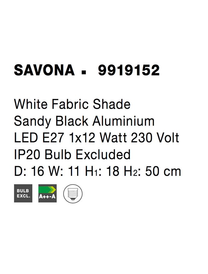 Срок на доставка: ПО ЗАПИТВАНЕ Продуктова информация Материал: White Fabric Shade & Sandy Black Aluminium Тип крушка: LED E27 1x12W 230V IP20 Bulb Excluded Код: 9919152 Тип продукт: WALL LUMINAIRES Размери: D: 16 W: 11 H1: 18 H2: 50 cm
