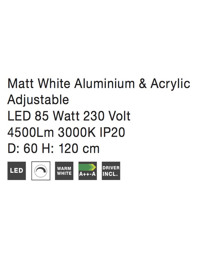 Matt White Aluminium & Acrylic Adjustable LED 85W 4500Lm 3000K IP20 D: 60 H: 120cm Dimmable