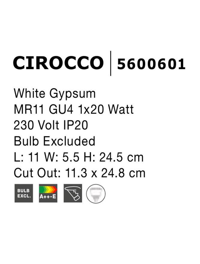 White Gypsum MR11 GU4 1×20 Watt 12 Volt IP20 Bulb Excluded L: 11 W: 5.5 H: 24.5 cm Cut Out: 11.3 x 24.8 cm