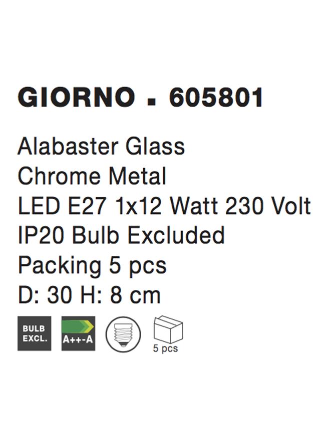 Срок на доставка: ПО ЗАПИТВАНЕ Продуктова информация Материал: Alabaster Glass Chrome Metal Тип крушка: LED E27 1x12W IP20 Bulb Excluded Код: 605801 Тип продукт: AGNES Размери: D: 30 H: 8 cm