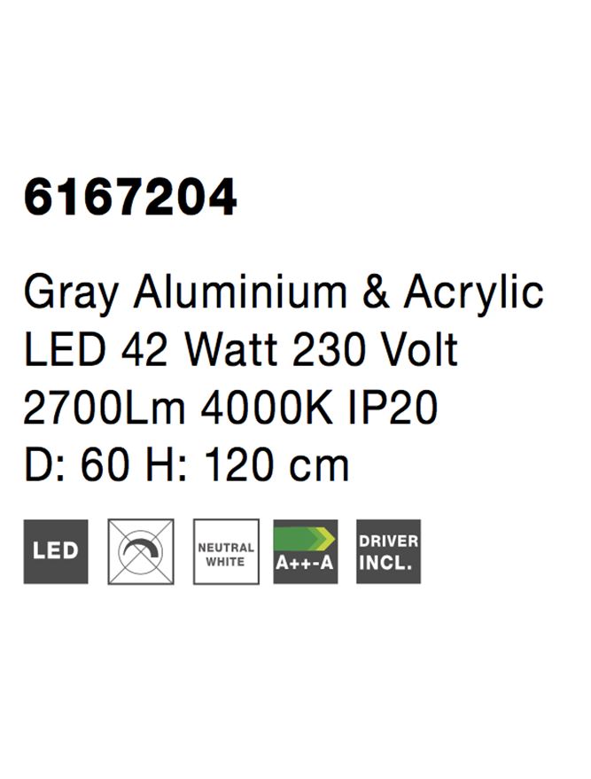 Gray Aluminium & Acrylic LED 42 Watt 230 Volt 2700Lm 4000K IP20 D: 60 H: 120 cm
