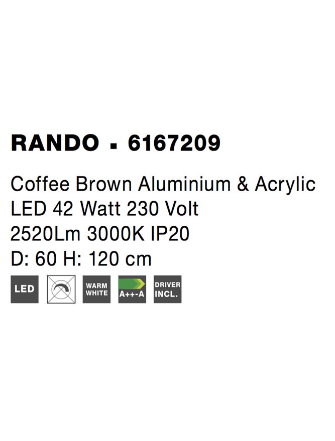 Срок на доставка: ПО ЗАПИТВАНЕ Продуктова информация Материал: Coffee Brown Metal & Acrylic Тип крушка: LED 42W 2520Lm 3000K IP20 Код: 6167209 Тип продукт: COMFORT Размери: D: 60 H: 120 cm
