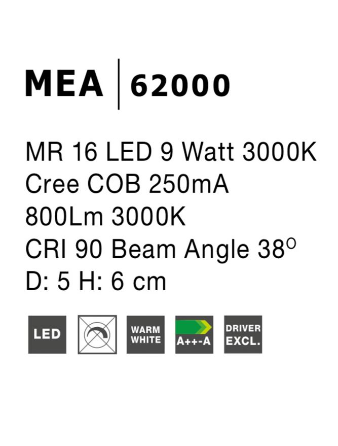 MR 16 LED 9 Watt 3000K Cree COB 250mA 800Lm 3000K CRI 90 Beam Angle 38O D: 5 H: 6 cm