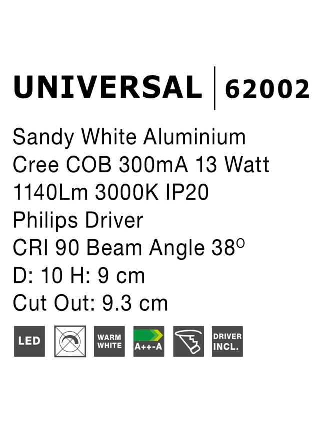 Срок на доставка: ПО ЗАПИТВАНЕ Продуктова информация Материал: Sandy White Aluminium Тип крушка: Cree COB 300mA 13 Watt 1140Lm 3000K IP20 Philips Driver CRI 90 Beam Angle 38O Код: 62002 Тип продукт: GU10 AND LED SPOTS Размери: D: 10 H: 9 cm Cut Out: 9.3 cm