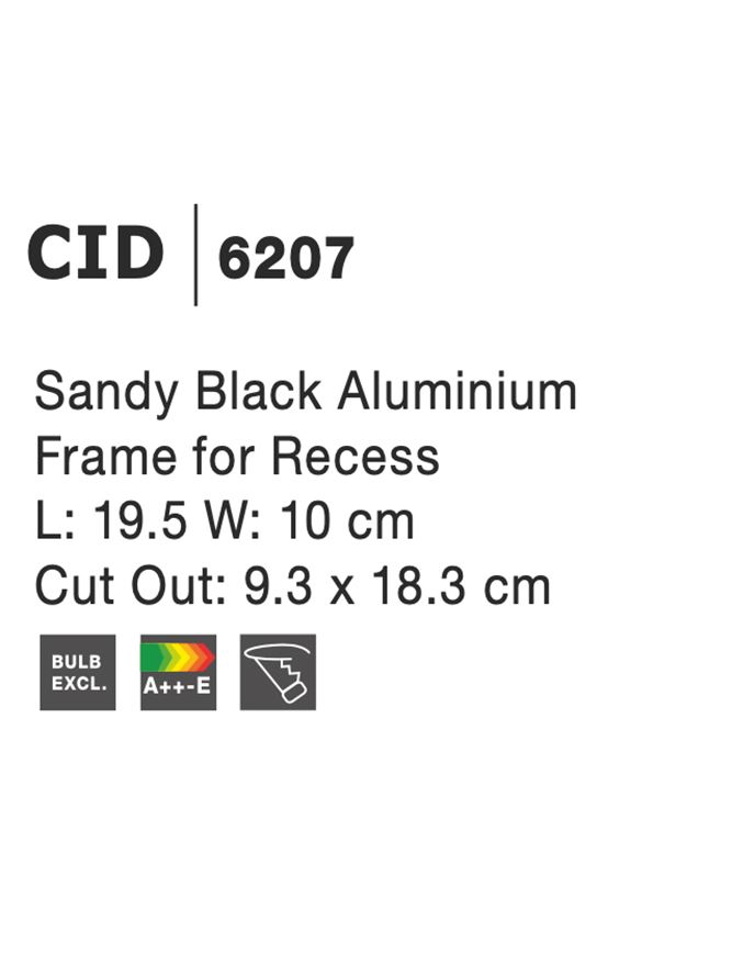 Срок на доставка: ПО ЗАПИТВАНЕ Продуктова информация Материал: Sandy Black Aluminium Тип крушка: Frame Код: 6207 Тип продукт: GU10 AND LED SPOTS Размери: L: 19.5 H: 10 cm