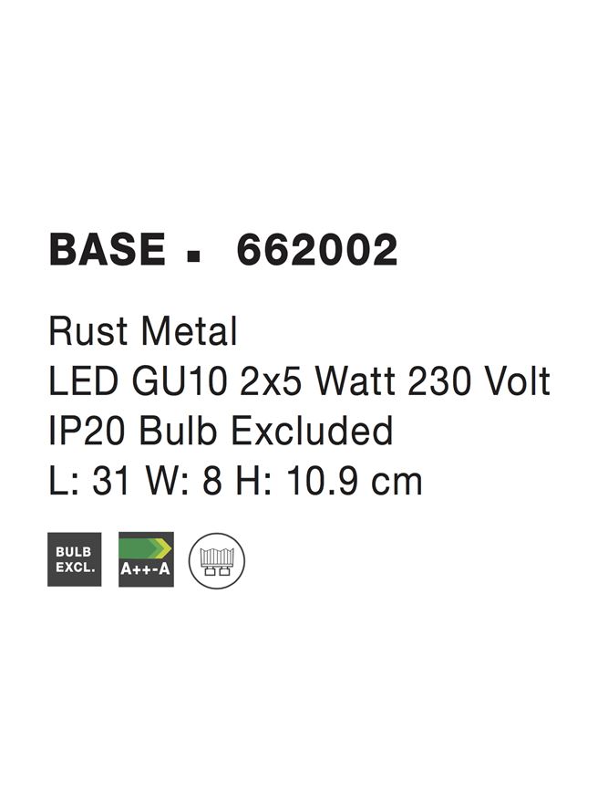 Срок на доставка: ПО ЗАПИТВАНЕ Продуктова информация Материал: Rust Metal Тип крушка: LED GU10 2x5W IP20 Bulb Excluded Код: 662002 Тип продукт: SPOT Размери: L: 31 W: 8 H: 10.9 cm
