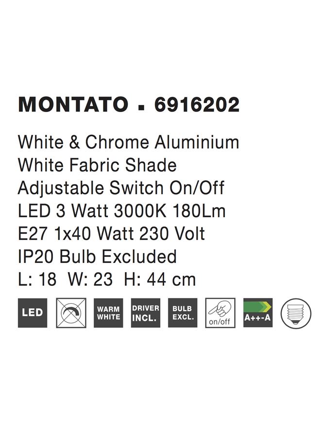 Срок на доставка: ПО ЗАПИТВАНЕ Продуктова информация Материал: White & Chrome Aluminium – White Fabric Shade Тип крушка: LED 3 Watt 3000K 180Lm E27 1×40 Watt 230 Volt IP20 Bulb Excluded Код: 6916202 Тип продукт: WALL LUMINAIRES Размери: L:18 W:23 H:44cm