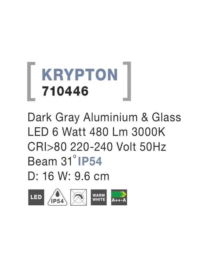 Dark Gray Aluminium & Glass LED 6 Watt 480Lm 3000K 220-240 Volt 50Hz Beam Angle 31o IP54 D: 16 W: 9.6 cm