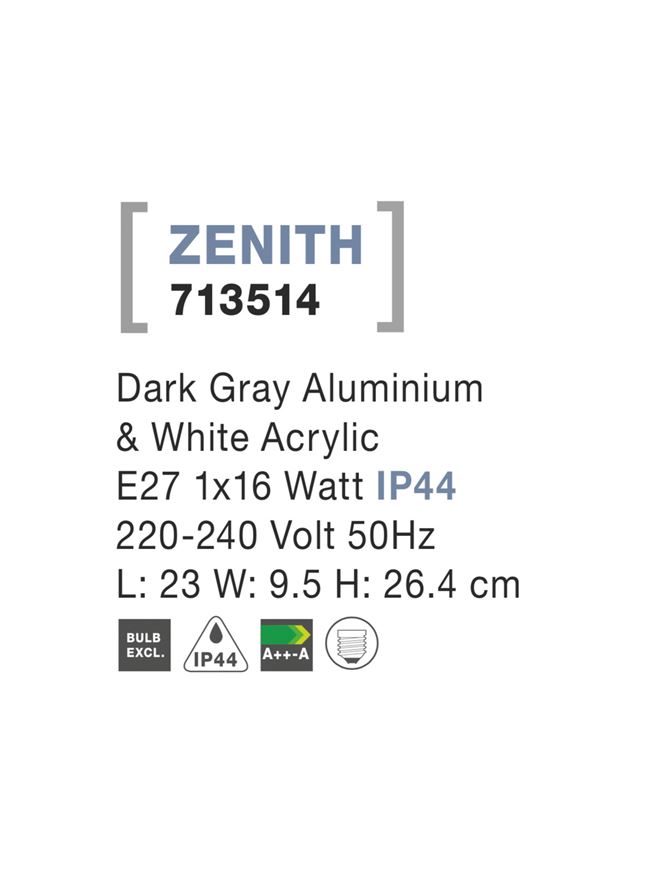 Срок на доставка: ПО ЗАПИТВАНЕ Продуктова информация Материал: Dark Gray Aluminium & White Acrylic Тип крушка: E27 1×16 Watt 220-240 Volt 50Hz -IP44 Код: 713514 Тип продукт: OUTDOOR – WALL Размери: L: 23 W: 9.5 H: 26.4 cm