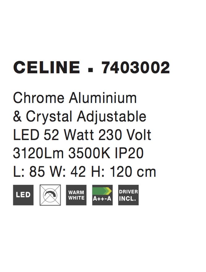 Срок на доставка: ПО ЗАПИТВАНЕ Продуктова информация Материал: Chrome Aluminium & Crystal Adjustable Тип крушка: LED 52 Watt 230 Volt 3120Lm 3500K IP20 Код: 7403002 Тип продукт: CRYSTAL Размери: L:85 W:42 H: 120 cm
