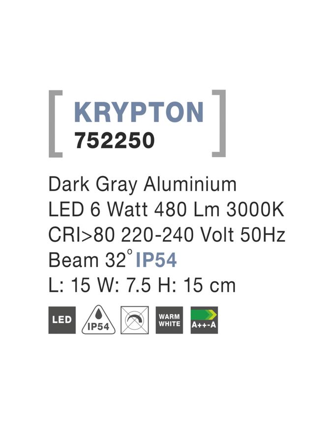Dark Gray Aluminium LED 6 Watt 751Lm 3000K 220-240 Volt 50Hz Beam Angle 32o IP54 L: 15 W: 7.5 H: 15 cm