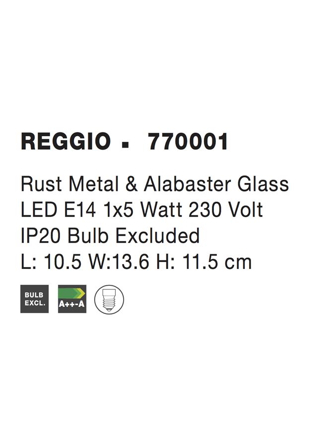 Срок на доставка: ПО ЗАПИТВАНЕ Продуктова информация Материал: Rust Metal & Alabaster Glass Тип крушка: LED E14 1×5 Watt 230 Volt IP20 Bulb Excluded Код: 770001 Тип продукт: SPOT Размери: L: 10.5 W:13.6 H: 11.5 cm