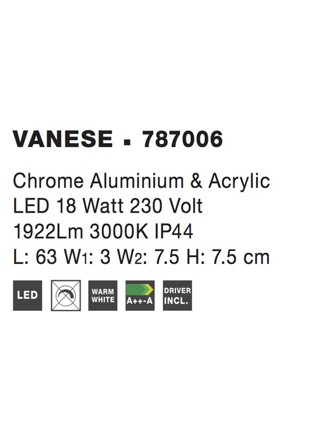 Chrome Aluminium & Acrylic LED 18W 1922Lm 3000K IP44 L: 63 W1: 3 W2: 7.5 H: 7.5 cm