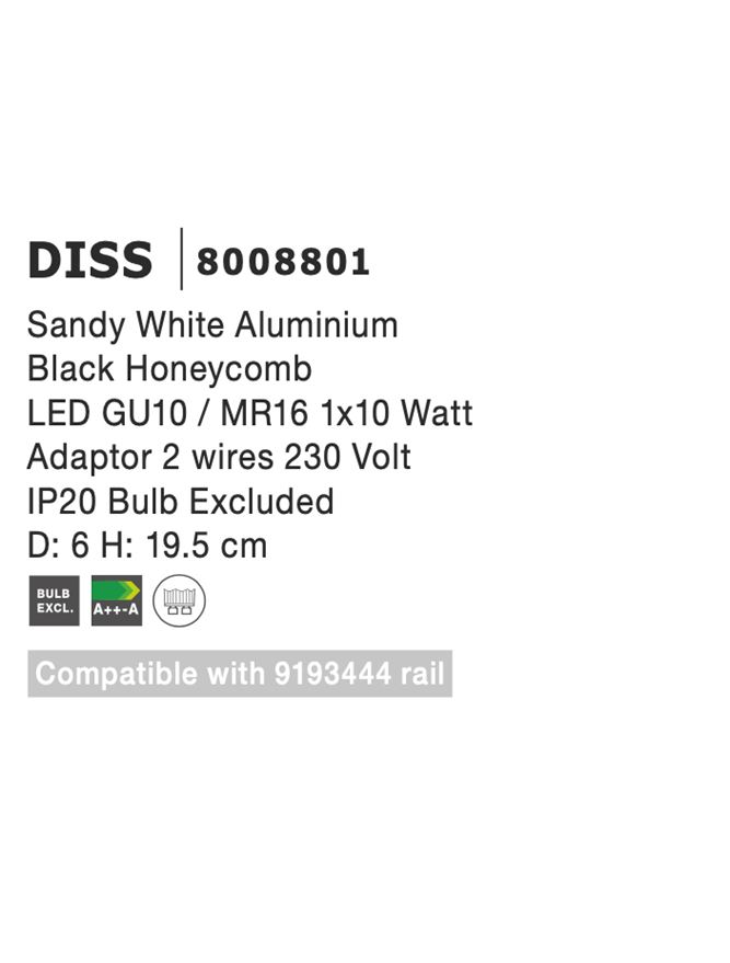 Sandy White Aluminium Black Honeycomb LED GU10 / MR16 1×10 Watt Adaptor 2 wires 230 Volt IP20 Bulb Excluded D: 6 H: 19.5 cm