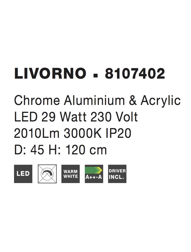 Срок на доставка: ПО ЗАПИТВАНЕ Продуктова информация Материал: Chrome Aluminium & Acrylic Adjustable Тип крушка: LED 29 Watt 230 Volt 2010Lm 3000K IP20 Код: 8107402 Тип продукт: ELEGANT Размери: D: 45 H: 120 cm