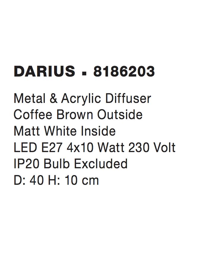 Срок на доставка: ПО ЗАПИТВАНЕ Продуктова информация Материал: Metal & Acrylic Diffuser Coffee Brown Outside Matt White Inside Тип крушка: LED E27 4×10 Watt 230 Volt IP20 Bulb Excluded Код: 8186203 Тип продукт: HIVE Размери: D: 40 H: 10 cm